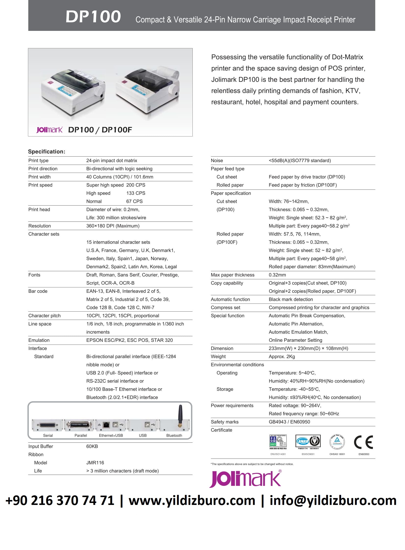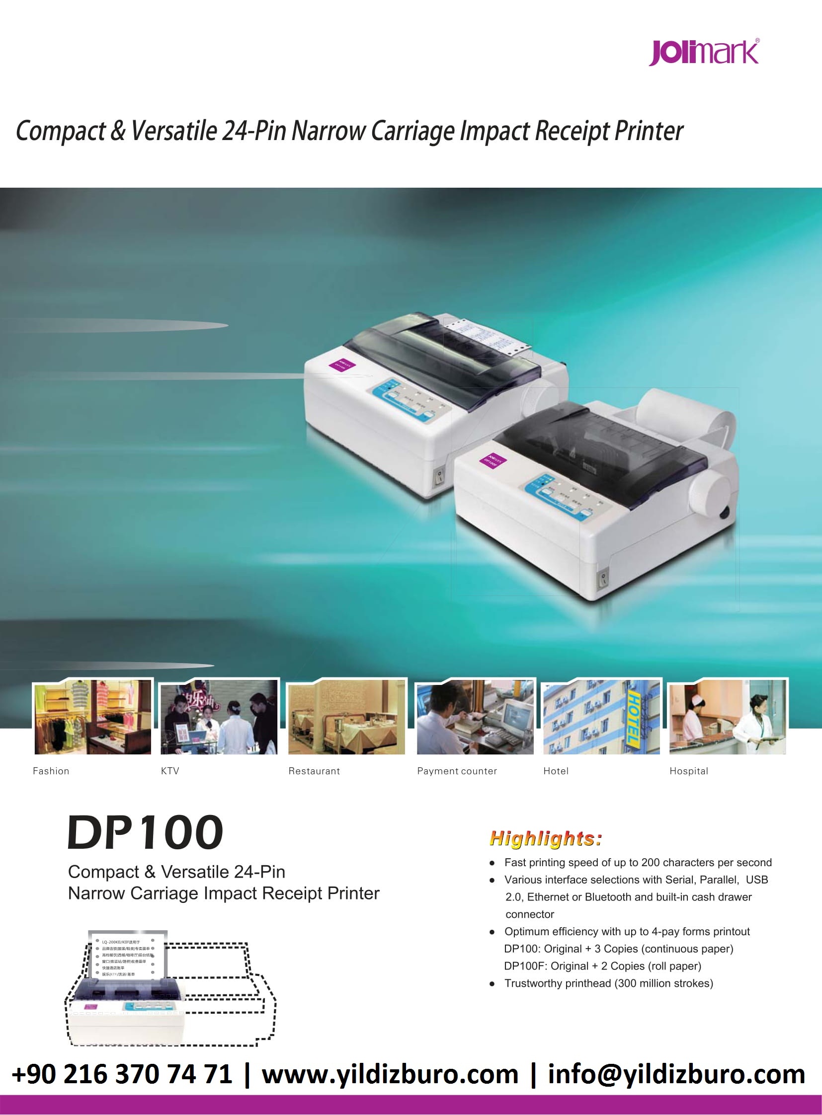 JOLIMARK DP-100 AYS Nokta vuruşlu Yazıcı 24 Pın 40 Kolon 200cpsTEKNİK ÖZELLİKLERJOLIMARK DP100 / DP1..