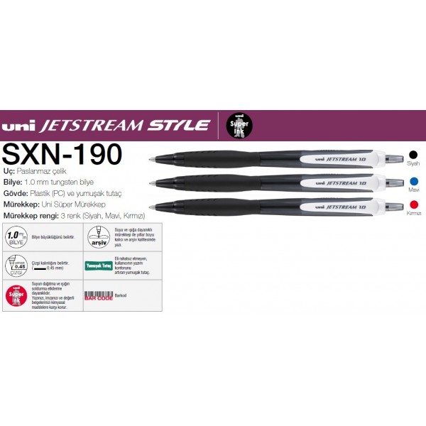 Uniball SXN-190 Siyah JETSTREAM STYLE 1.0 RT Mürekkepli Roller Hızlı Yazı KalemiJetstream Mürekkepli..