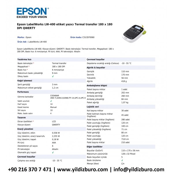 Etiketler: EPSON LW-400 Labelworks Taşınabilir Masaüstü Etiket Yazıcısı, EPSON LW-400, LW-400,