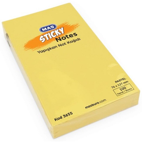 Mas 3655 Yapışkanlı Çıkarılabilir Not Kağıdı, 76 x 127mm , Pastel 100 Sayfa SarıYapışkanlı Çıkabilir..