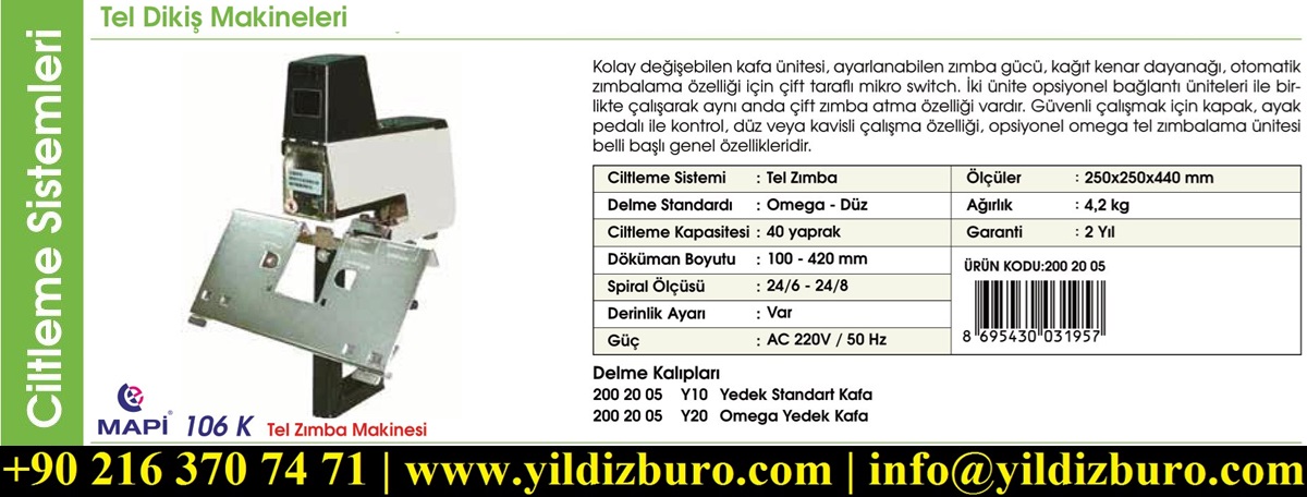 MAPİ 106 K Zımba MakinesiKolay değişebilen kafa ünitesi, ayarlanabilen zımba gücü, kağıt kenar daya..