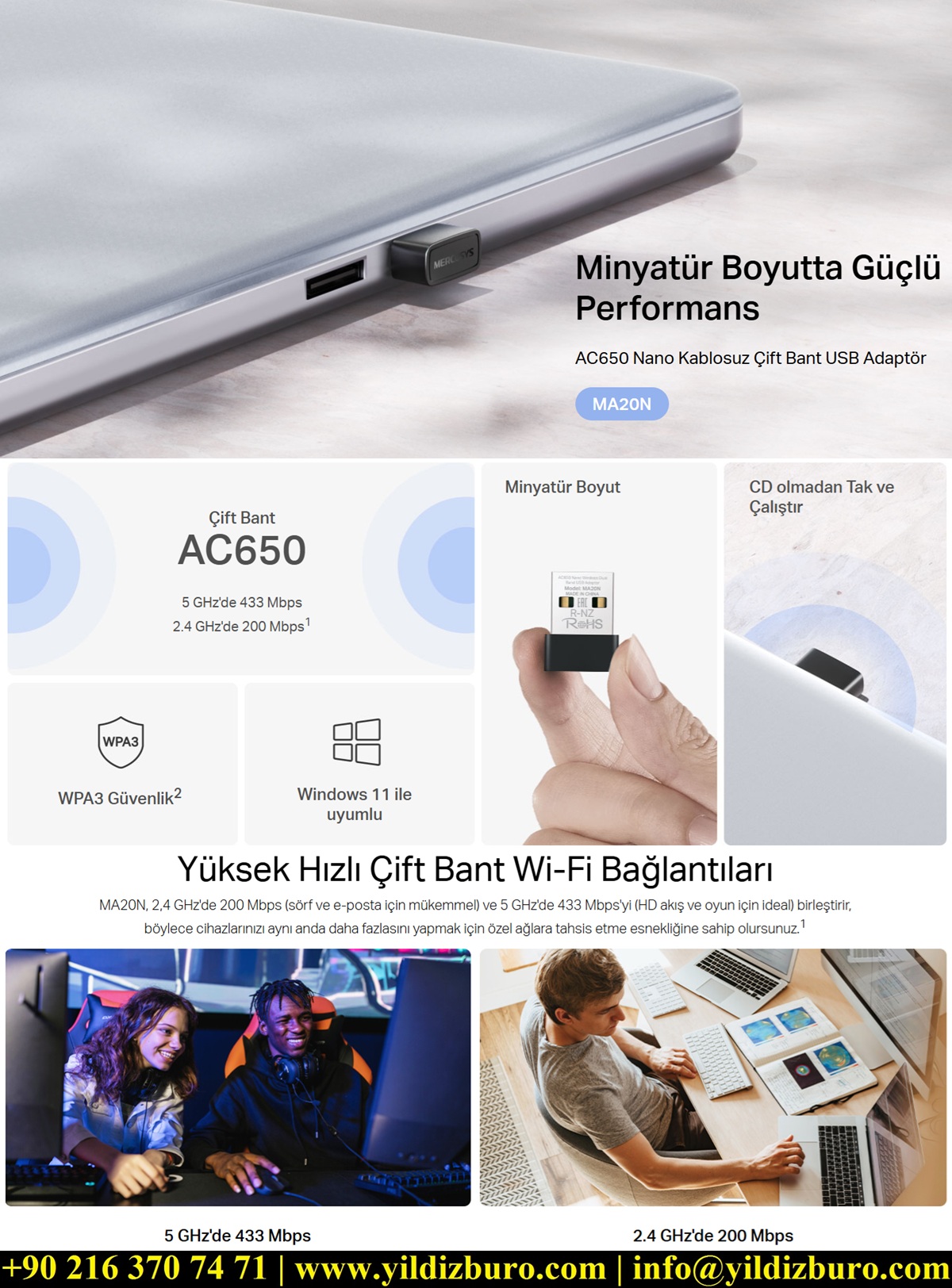 Çift Bant Wi-Fi Hızı — Hızlar: 433 Mbps (5 GHz) + 200 Mbps (2.4